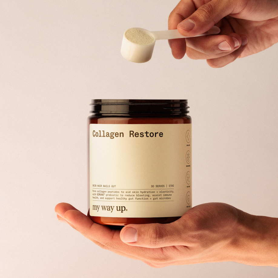 A highly absorbable collagen peptide formula that works to help restore plump, firm, bouncy skin and improve gut health.